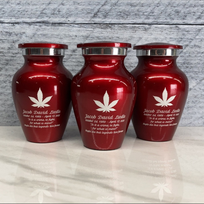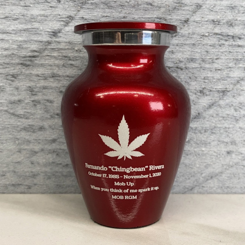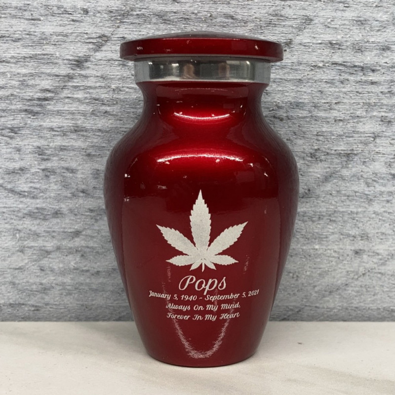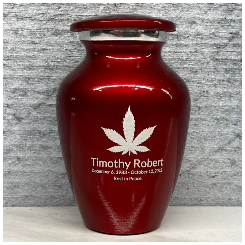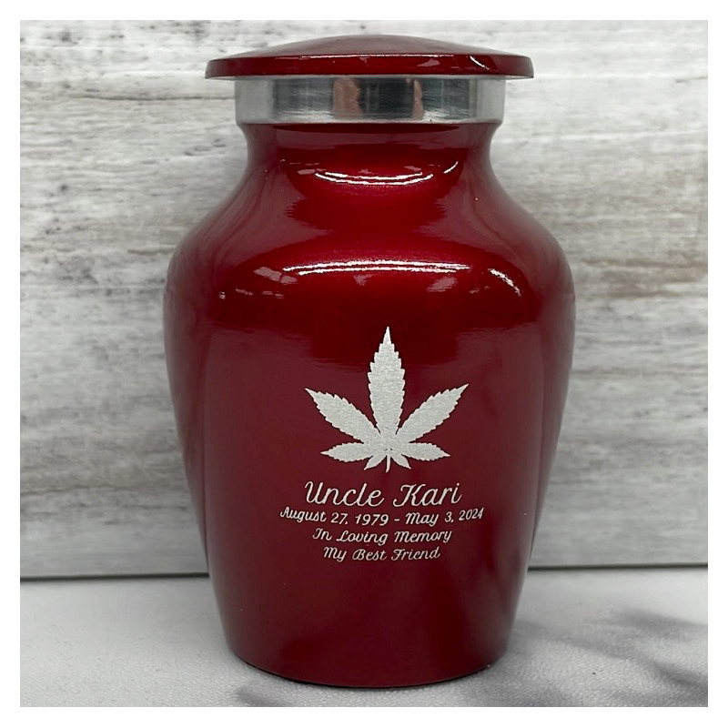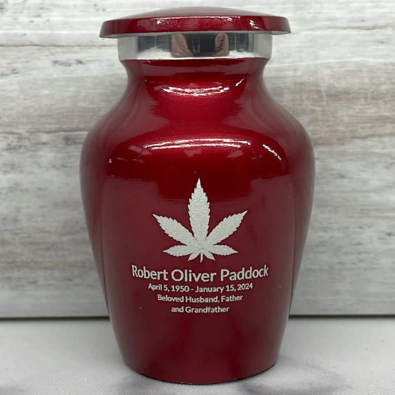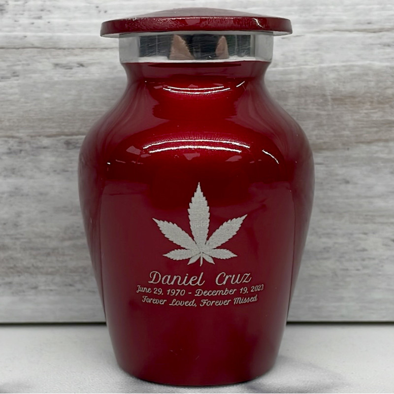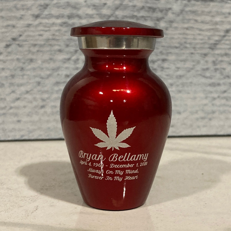 The Ruby Red Marijuana Keepsake Cremation Urn is a special way to keep your loved one close and can be purchased for yourself or for you close family and friends.