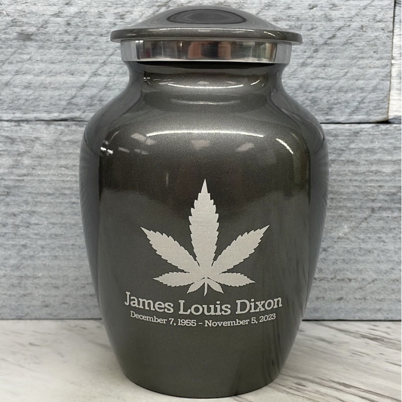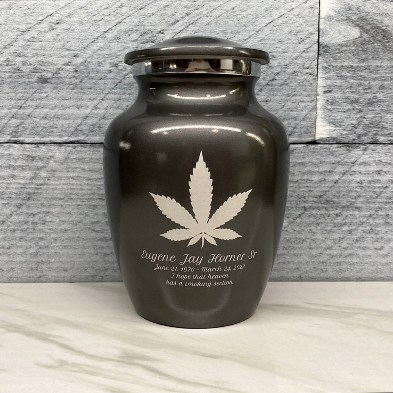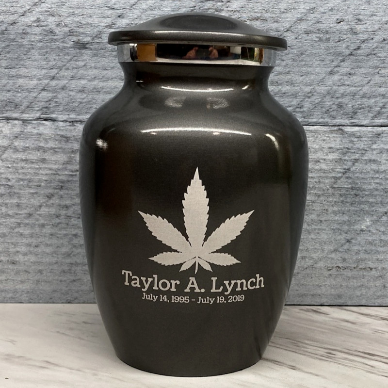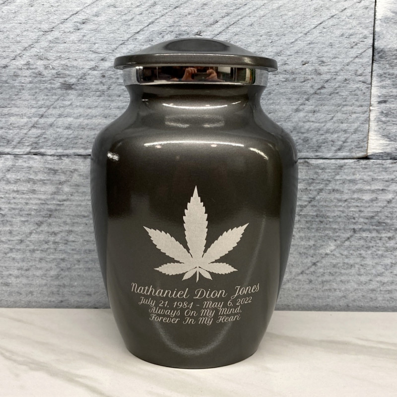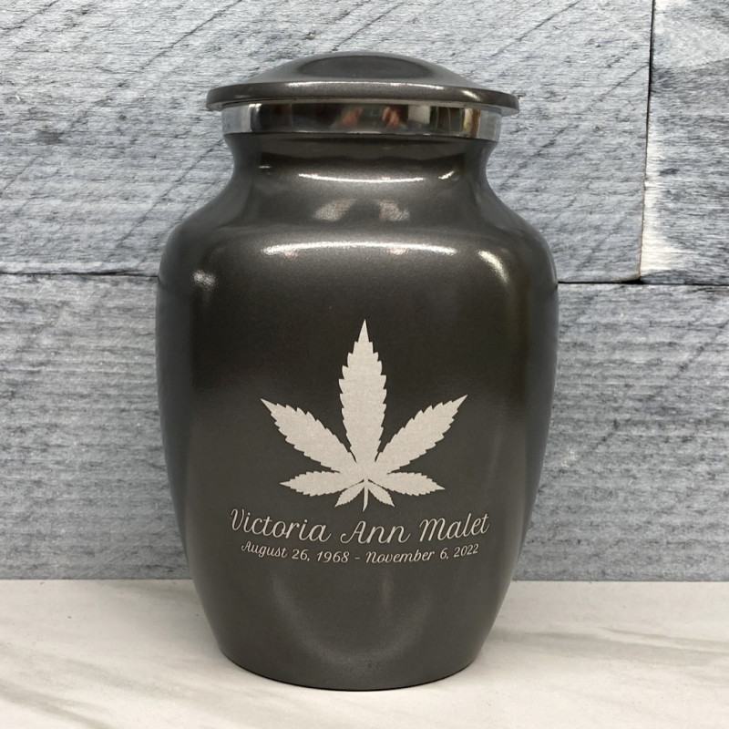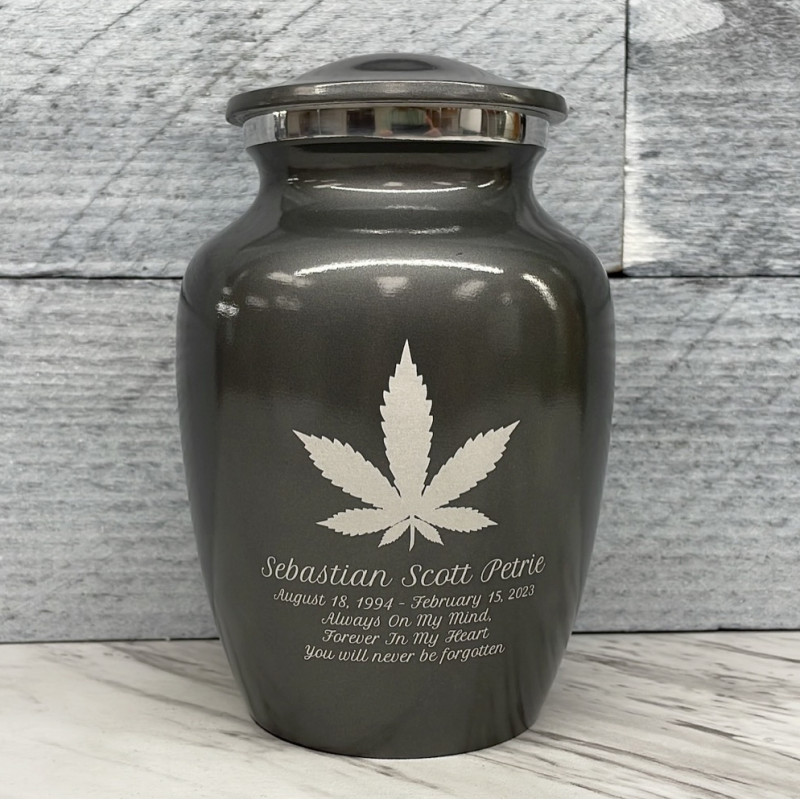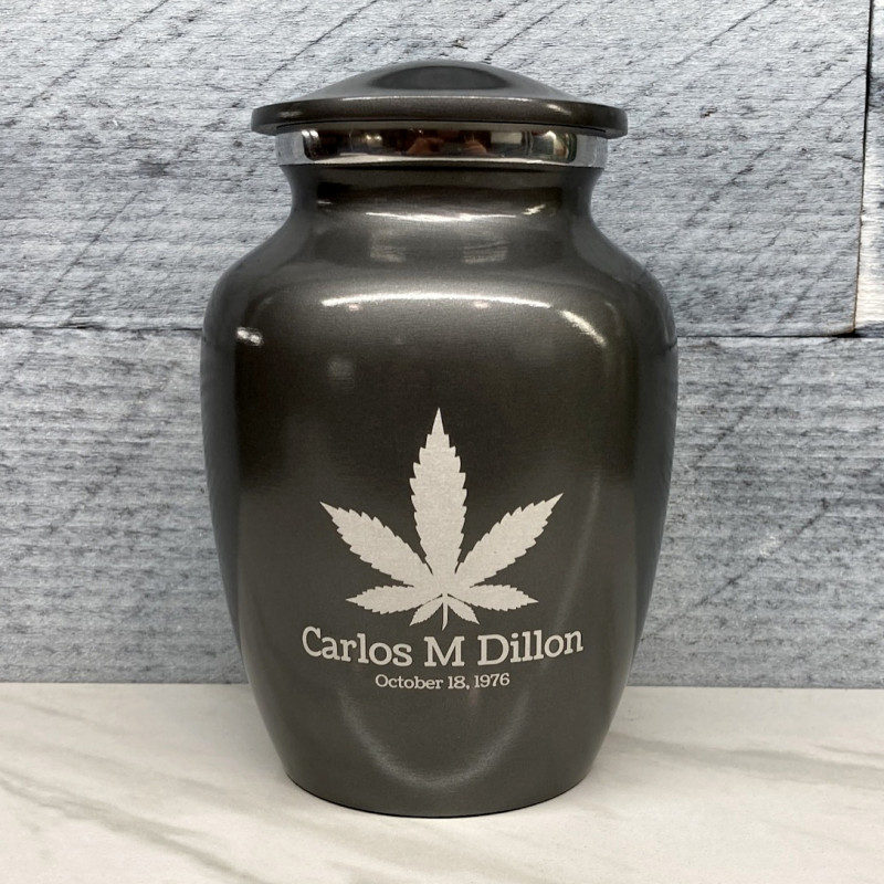 Remember the good times with the Gunmetal Gray Marijuana Sharing Cremation urn. It's an outstanding value that allows everyone in the family to have a memorial of their own. Optional engraving front and back there are many ways to make the urn unique to your loved one. A threaded lid and felt base ensure it securely closes and protects display surfaces.