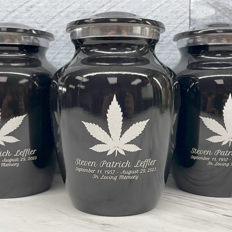 Select a Marijuana Sharing Urn to create a personal memorial that is a step larger than a keepsake urn but more petite than a full size urn. Bold, attractive colors offer sharp contrast with the engraved text and detailed artwork.