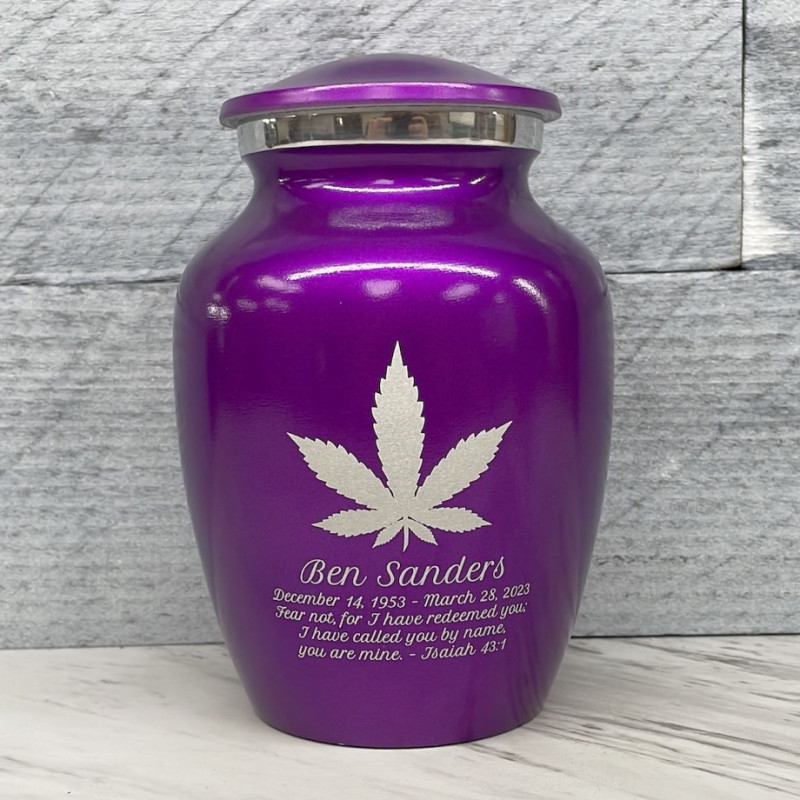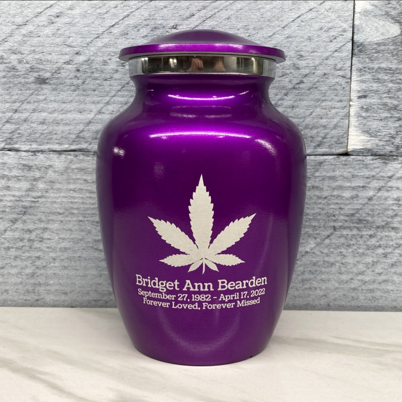 Remember the good times with the Purple Luster Marijuana Sharing Cremation urn. It's an outstanding value that allows everyone in the family to have a memorial of their own. Optional engraving front and back there are many ways to make the urn unique to your loved one. A threaded lid and felt base ensure it securely closes and protects display surfaces.
