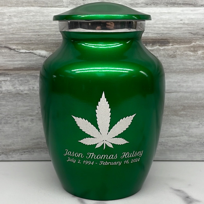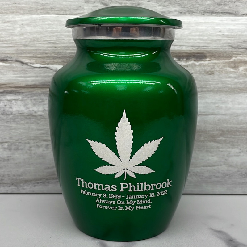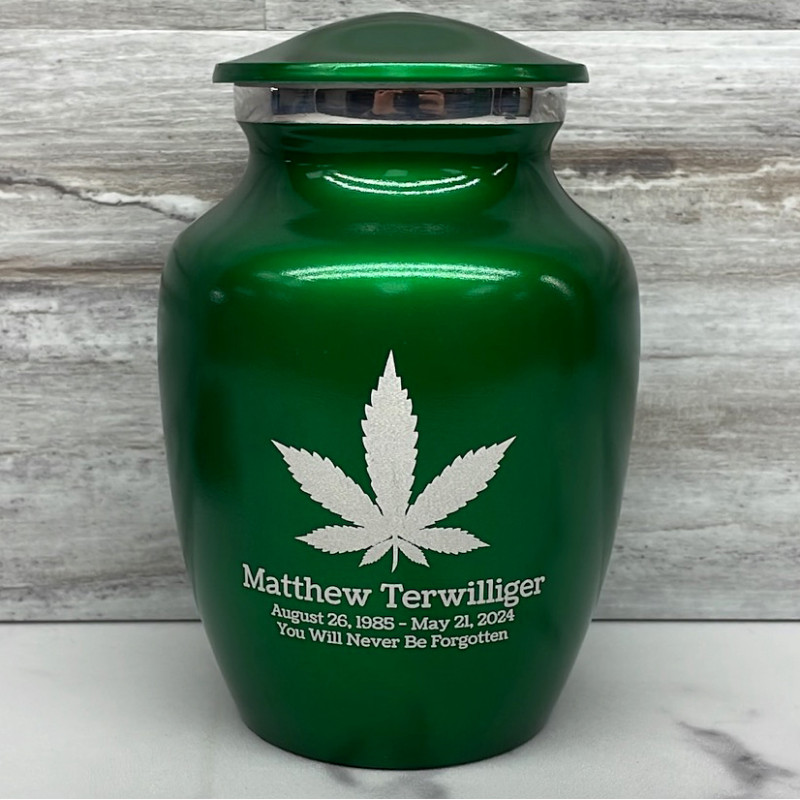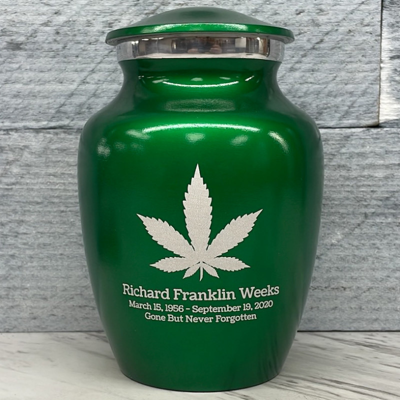 Remember the good times with the Shamrock Green Marijuana Sharing Cremation urn. It's an outstanding value that allows everyone in the family to have a memorial of their own. Optional engraving front and back there are many ways to make the urn unique to your loved one. A threaded lid and felt base ensure it securely closes and protects display surfaces.