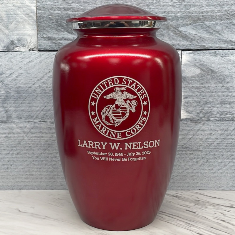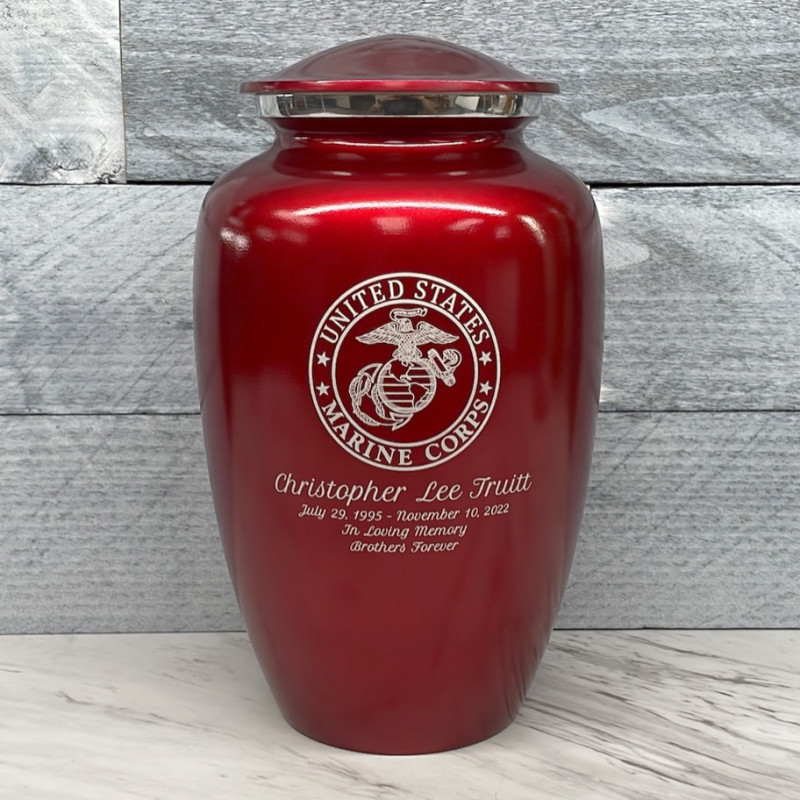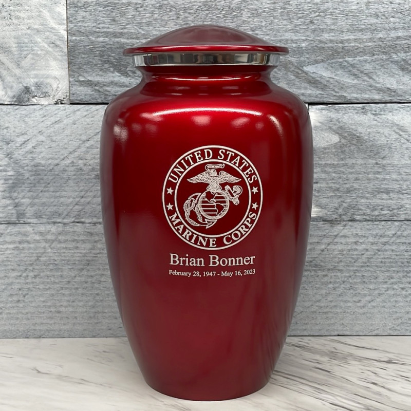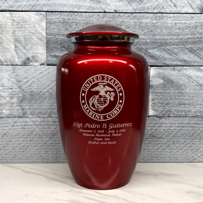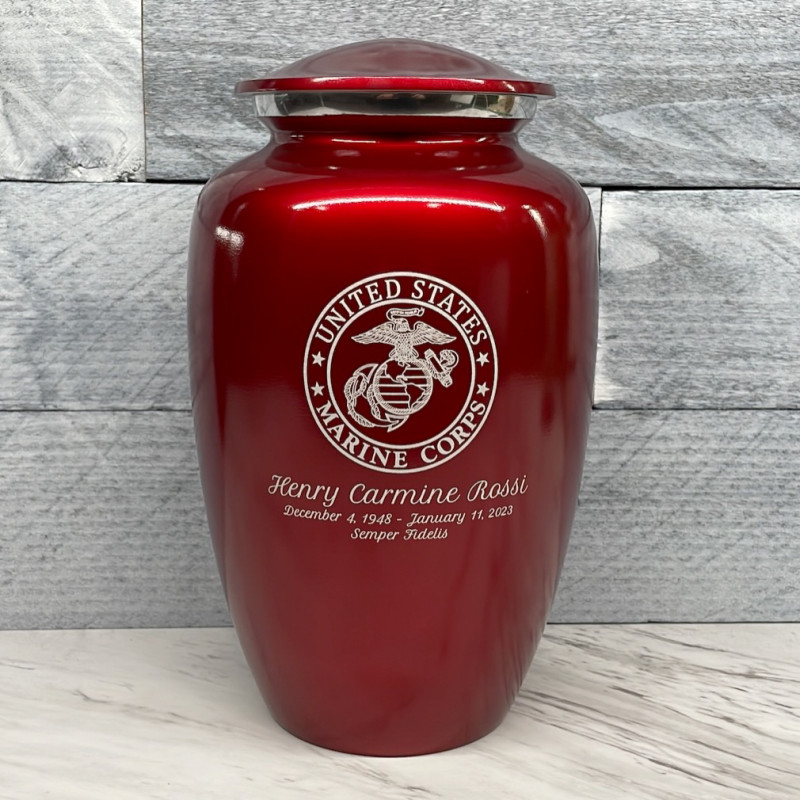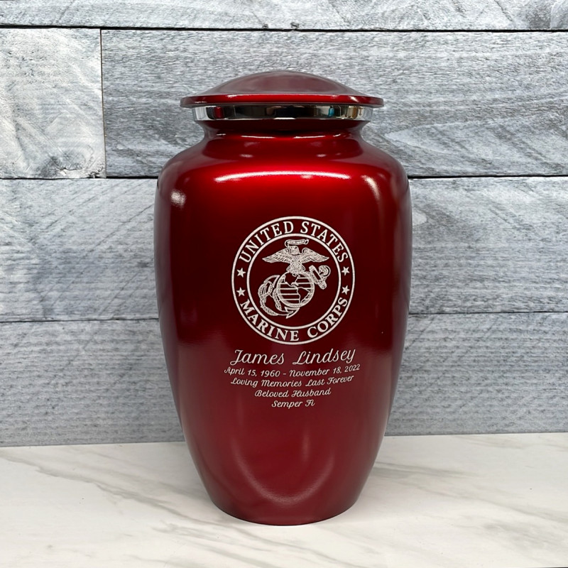 The Ruby Red Marine Corps Cremation Urn is a handsome way to memorialize your beloved and dedicated veteran. Available custom engraving on the front and back of the urn allows for the creation of a truly unique memorial.