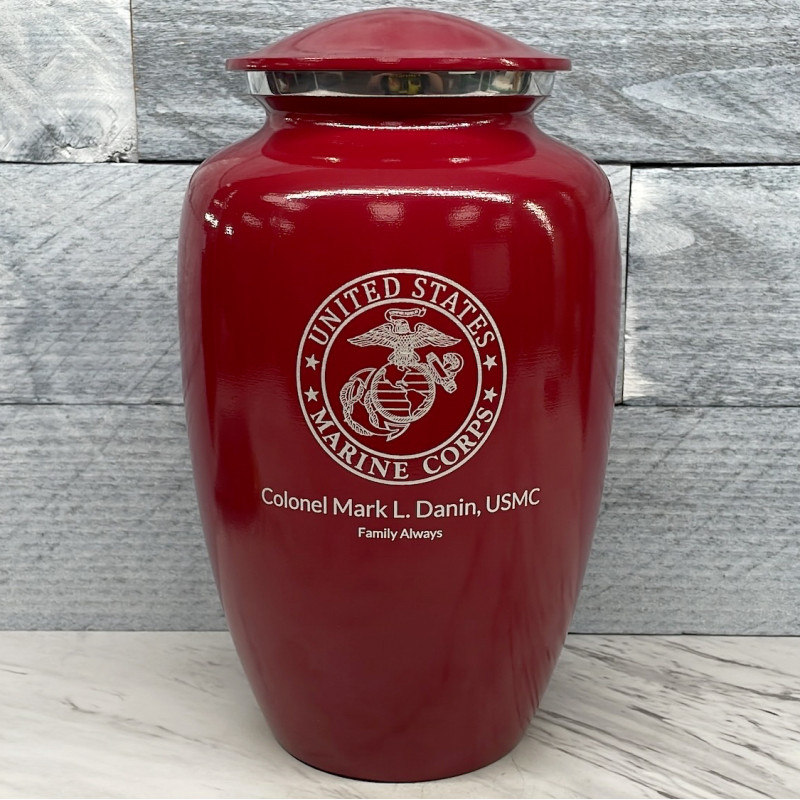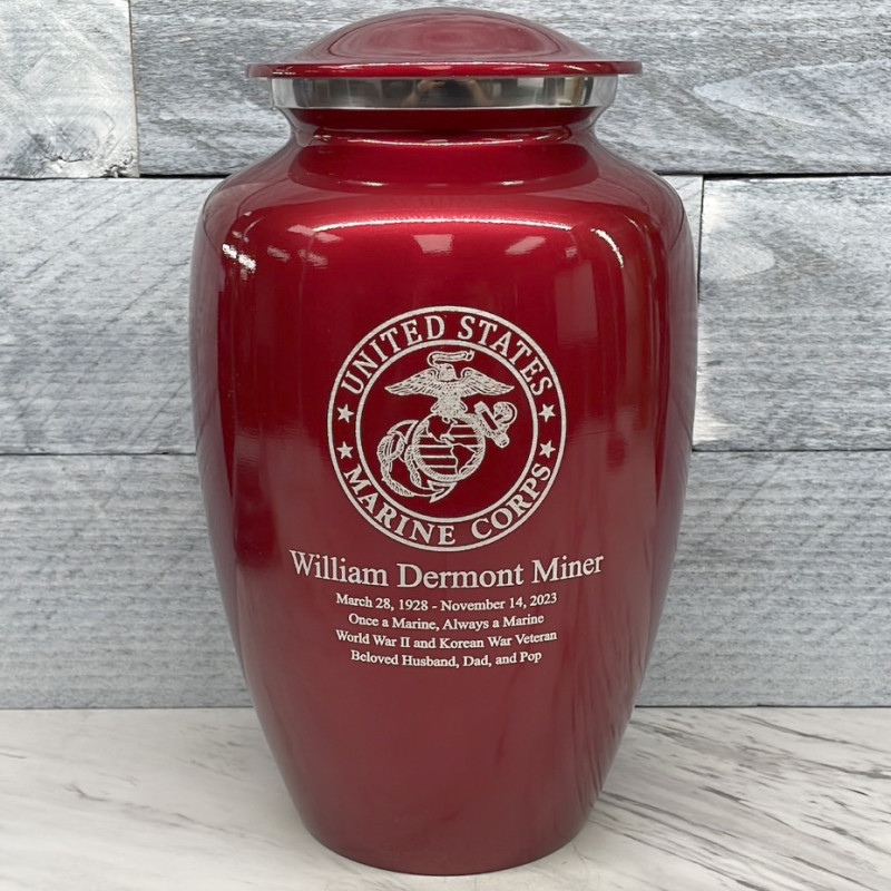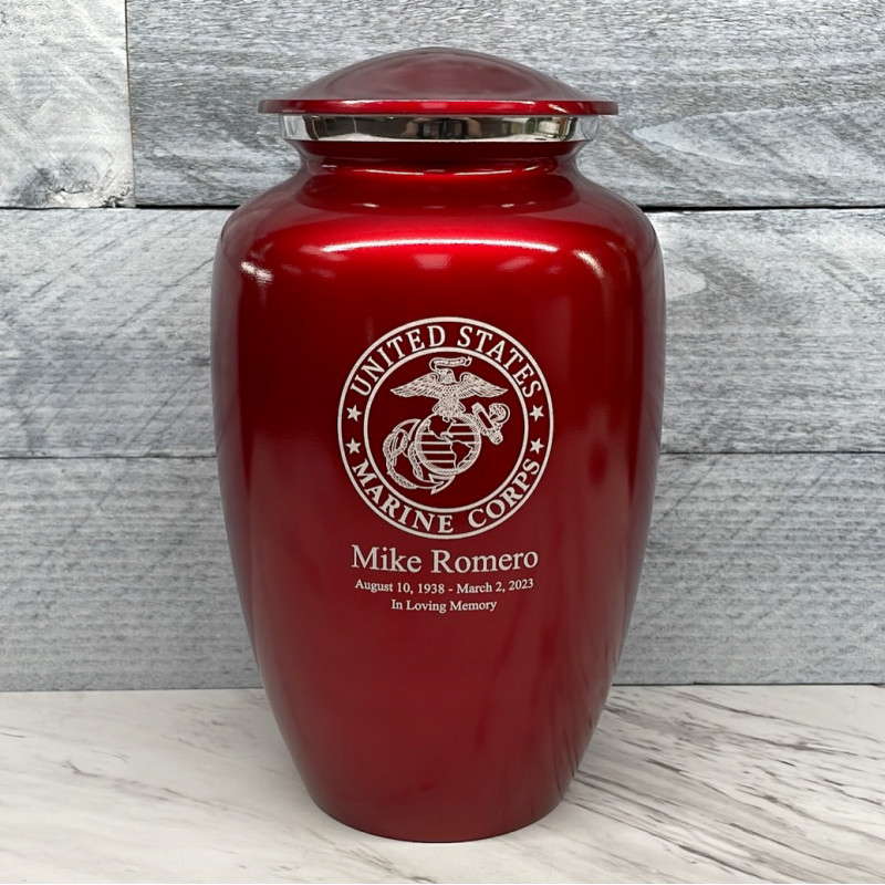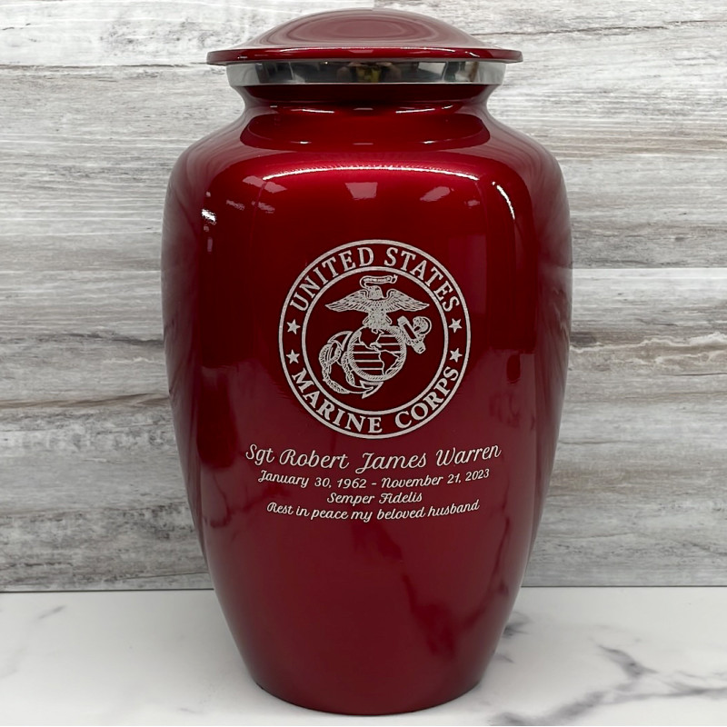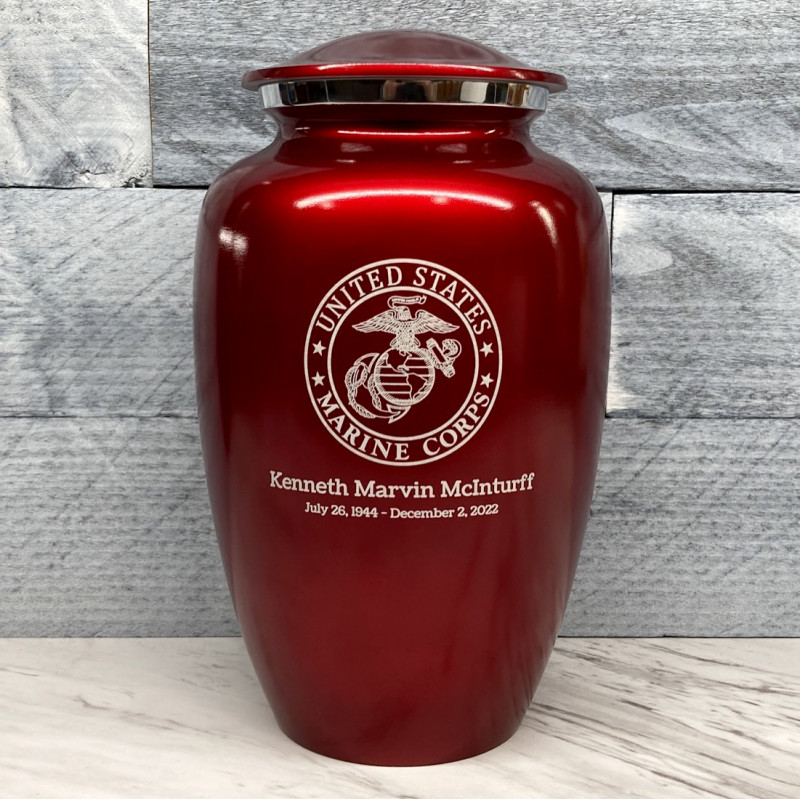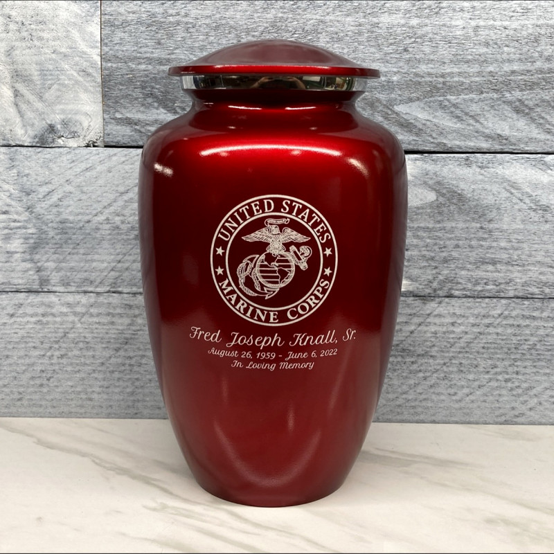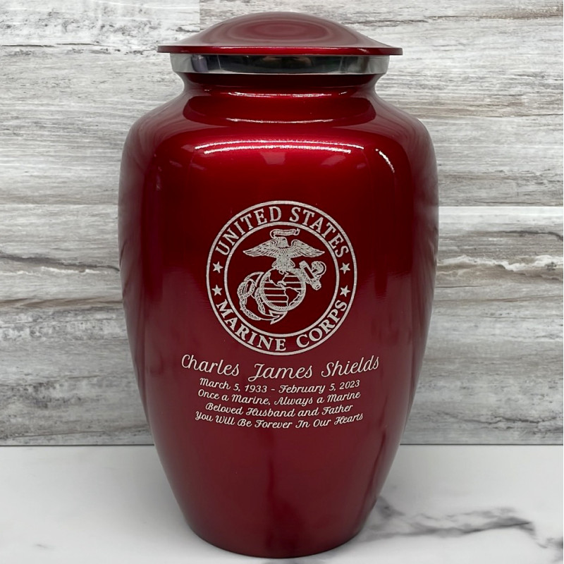 The Ruby Red Marine Corps Cremation Urn is a handsome way to memorialize your beloved and dedicated veteran. Available custom engraving on the front and back of the urn allows for the creation of a truly unique memorial.
