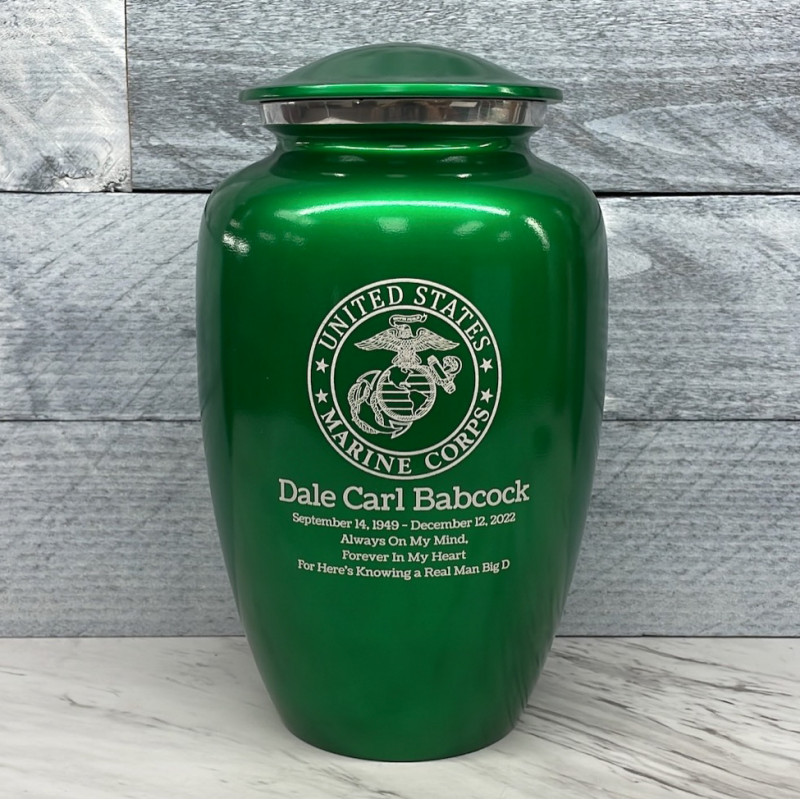 The Shamrock Green Marine Corps Cremation Urn is a handsome way to memorialize your beloved and dedicated veteran. Available custom engraving on the front and back of the urn allows for the creation of a truly unique memorial.