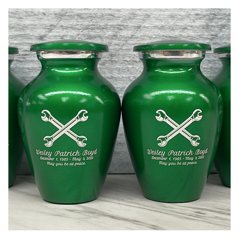 The Shamrock Green Mechanic Wrench Keepsake Cremation Urn keeps the memory of your loved one close and memorializes them with a detailed crossed wrenches engraving. These detailed crossed wrenches along with optional engraving that includes a name line, date line and three lines for sentiments allows for the creation of completely custom personal memorials.