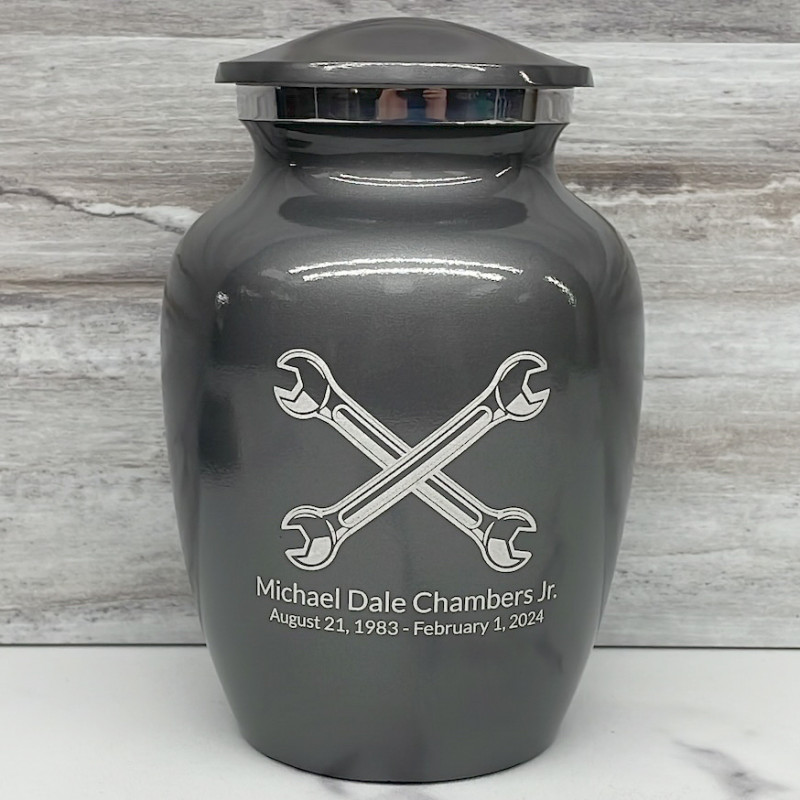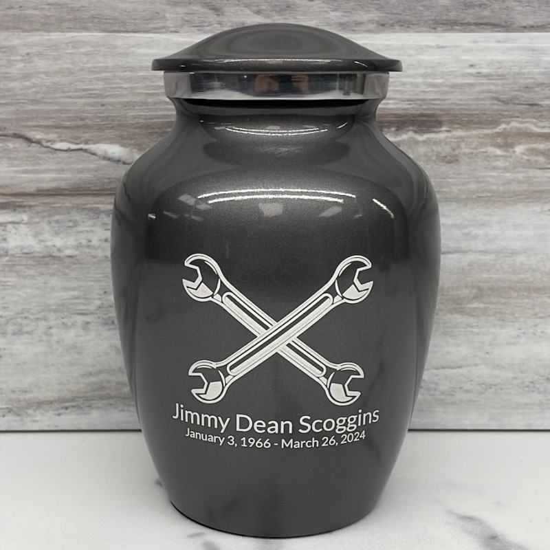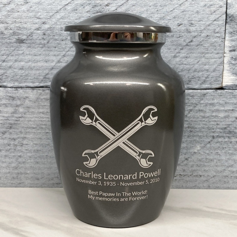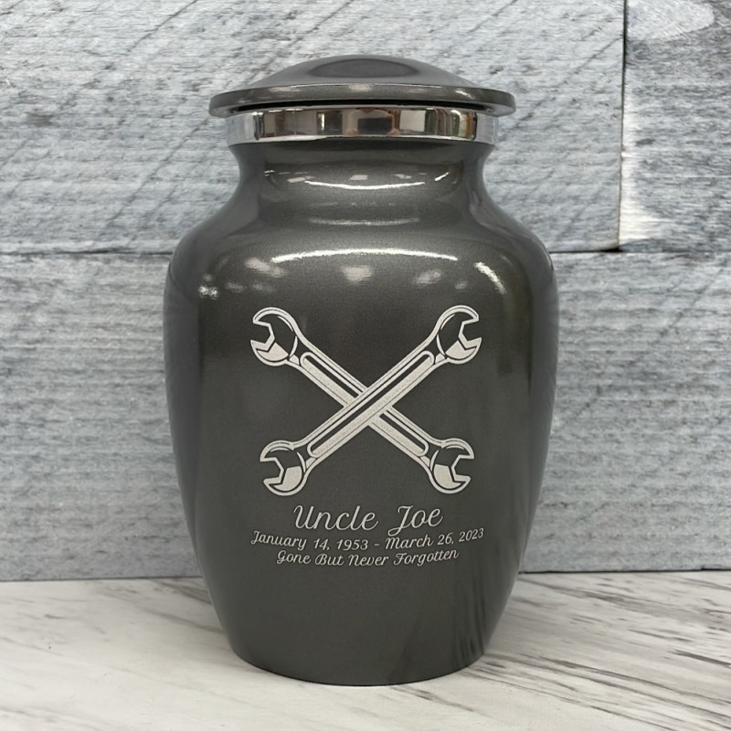 Remember your beloved garage expert with the Gunmetal Gray Mechanic Wrench Sharing Cremation urn. It's an outstanding value that allows everyone in the family to have a memorial of their own. Optional engraving front and back there are many ways to make the urn unique to your loved one. A threaded lid and felt base ensure it securely closes and protects display surfaces.