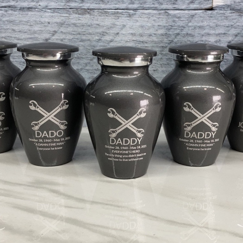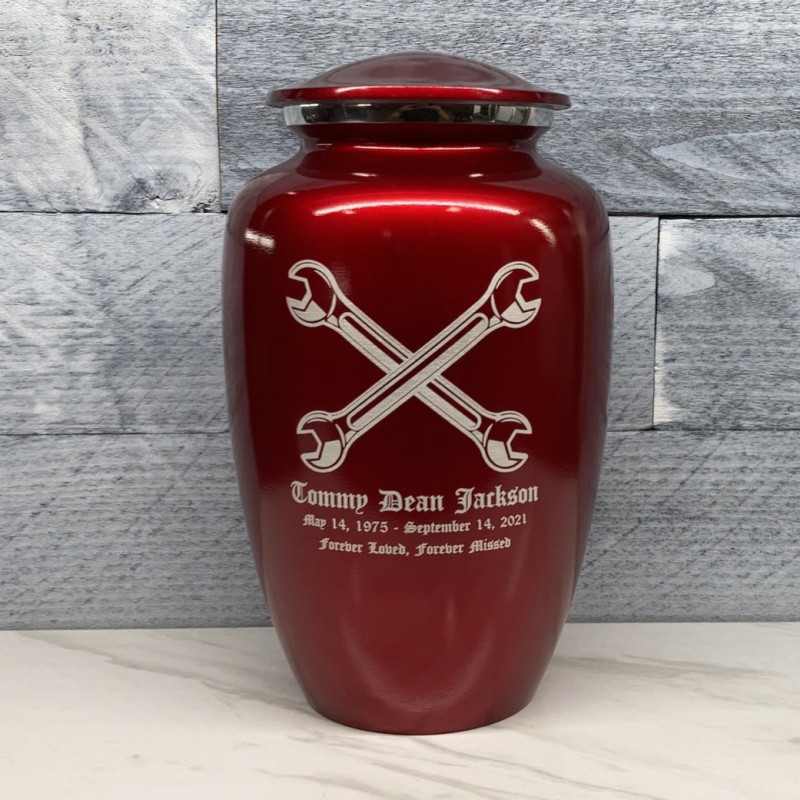 Remember your beloved garage expert with the Ruby Red Mechanic Wrench Sharing Cremation urn. It's an outstanding value that allows everyone in the family to have a memorial of their own. Optional engraving front and back there are many ways to make the urn unique to your loved one. A threaded lid and felt base ensure it securely closes and protects display surfaces.