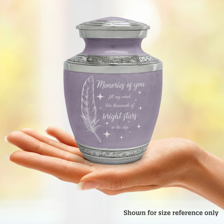 Select Memories Of You - Bright Stars Sharing Urn - Regal Purple to create a personal memorial that is a step larger than a keepsake urn but more petite than a full size urn. Bold, attractive colors offer sharp contrast with the engraved text and detailed artwork.