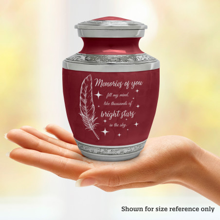 Select Memories Of You - Bright Stars Sharing Urn - Rose Red to create a personal memorial that is a step larger than a keepsake urn but more petite than a full size urn. Bold, attractive colors offer sharp contrast with the engraved text and detailed artwork.