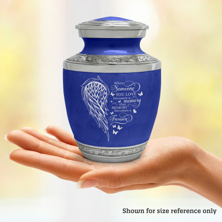 Select Memory Becomes a Treasure Sharing Urn - Royal Blue to create a personal memorial that is a step larger than a keepsake urn but more petite than a full size urn. Bold, attractive colors offer sharp contrast with the engraved text and detailed artwork.