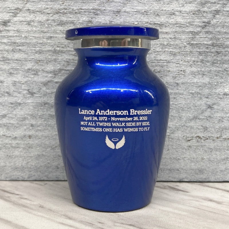 This small blue urn is only large enough to hold a small amount of ashes and is meant to be paired with a full size urn and potentially other keepsake urns. Please reference the product photos for a size comparison photo.