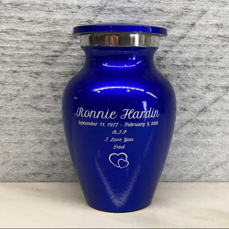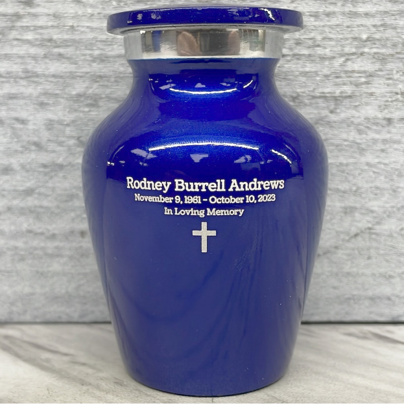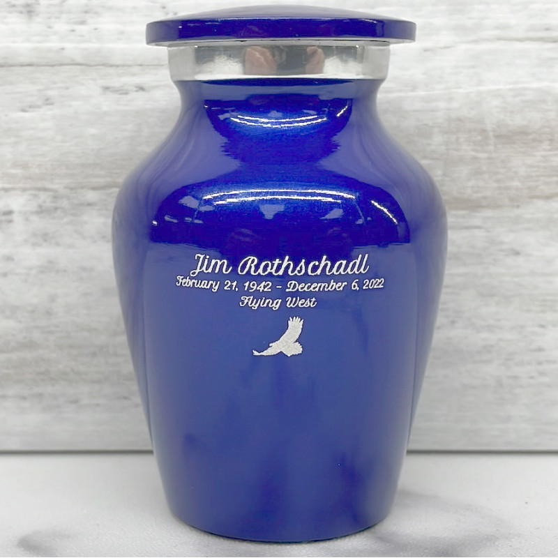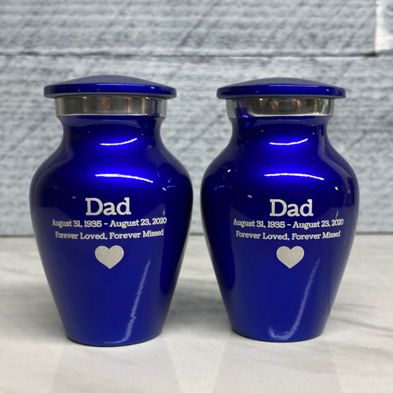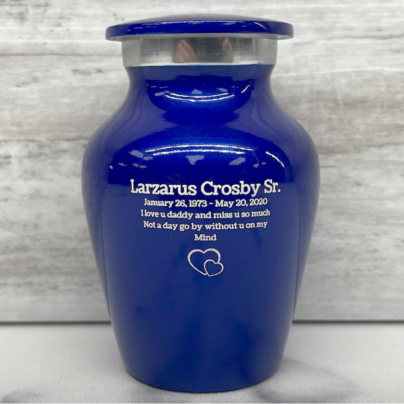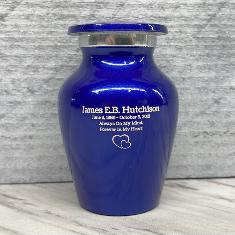 Our Midnight Blue Cremation Urn in miniature is a keepsake memorial that is both modern and traditional. It is the perfect size for sharing ashes with family members or keeping a loved one close at all times.