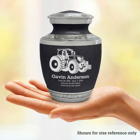 Select Modern Tractor Sharing Urn - Ebony Black to create a personal memorial that is a step larger than a keepsake urn but more petite than a full size urn. Bold, attractive colors offer sharp contrast with the engraved text and detailed artwork.