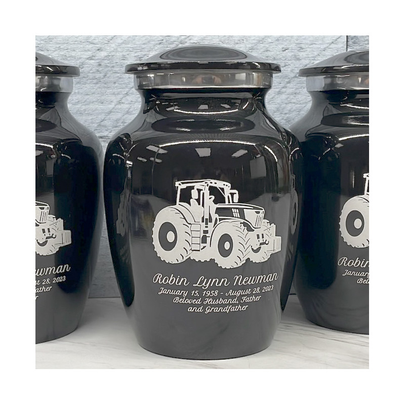 Select a Modern Tractor Sharing Urn to create a personal memorial that is a step larger than a keepsake urn but more petite than a full size urn. Bold, attractive colors offer sharp contrast with the engraved text and detailed artwork.