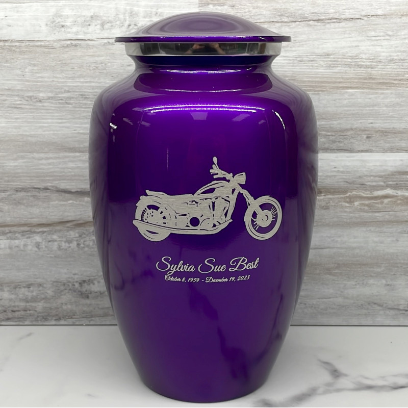 The Purple Luster Urn has an attractive metallic finish. The Motorcycle Urn in Purple Luster combines our most popular artwork engraving with our most popular urn color. This urn is a fitting tribute for the loved one who was always planning their next ride.