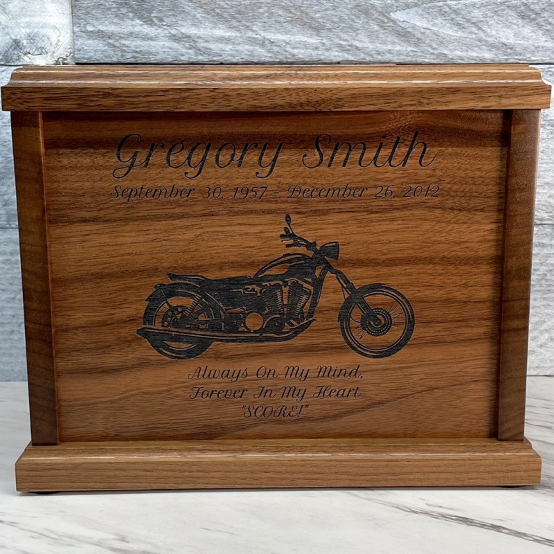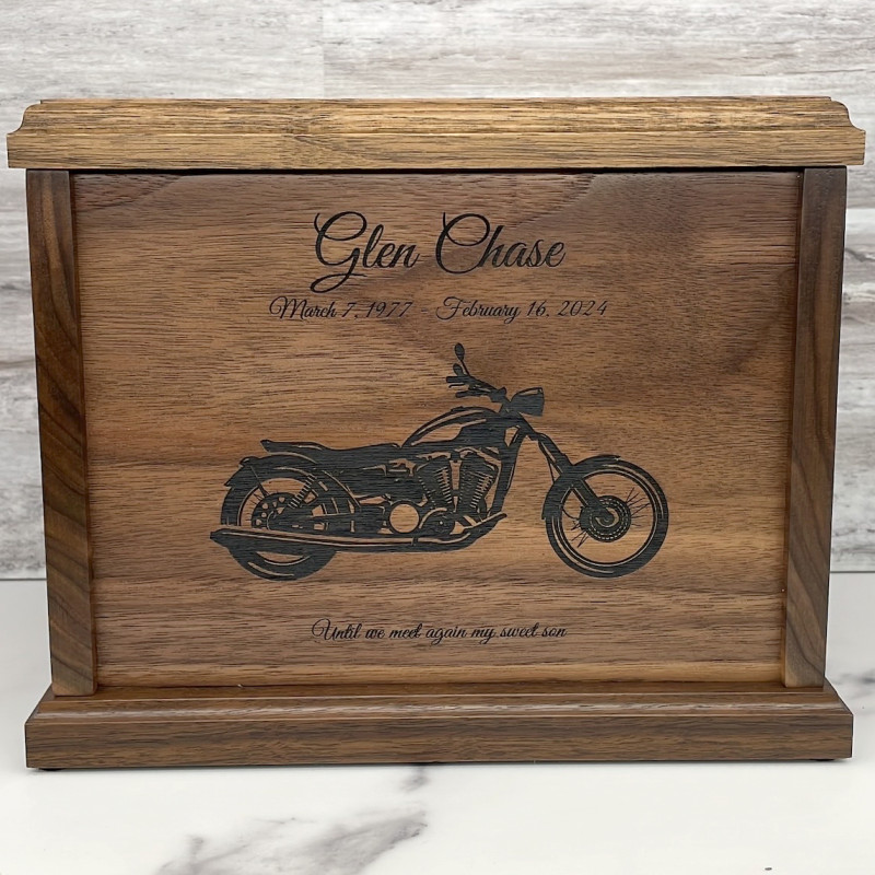 This made in the USA solid walnut Motorcycle urn is custom built for Green Meadow Memorials to meet our demanding specifications for a beautiful, high quality hardwood urn. The solid walnut has an attractive natural color that is timeless and works well with our direct laser engraving process.