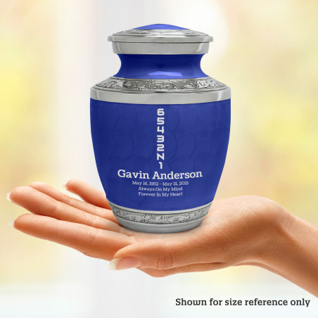 Select Motorcycle Gears Sharing Urn - Royal Blue to create a personal memorial that is a step larger than a keepsake urn but more petite than a full size urn. Bold, attractive colors offer sharp contrast with the engraved text and detailed artwork.