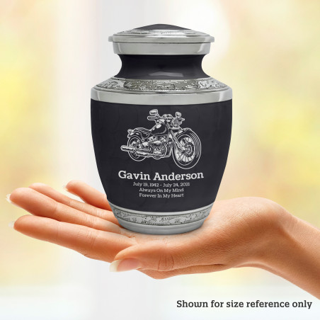Select Motorcycle II Sharing Urn - Ebony Black to create a personal memorial that is a step larger than a keepsake urn but more petite than a full size urn. Bold, attractive colors offer sharp contrast with the engraved text and detailed artwork.