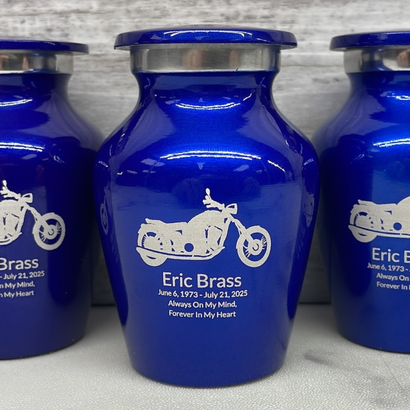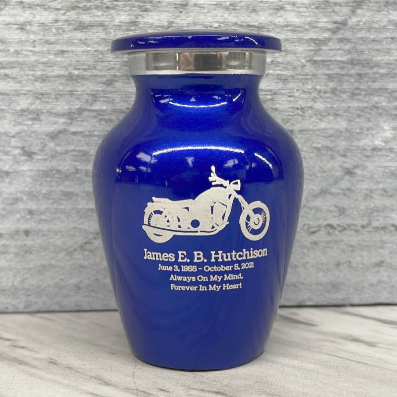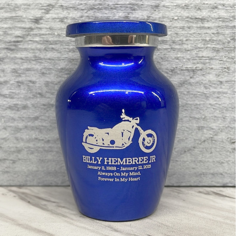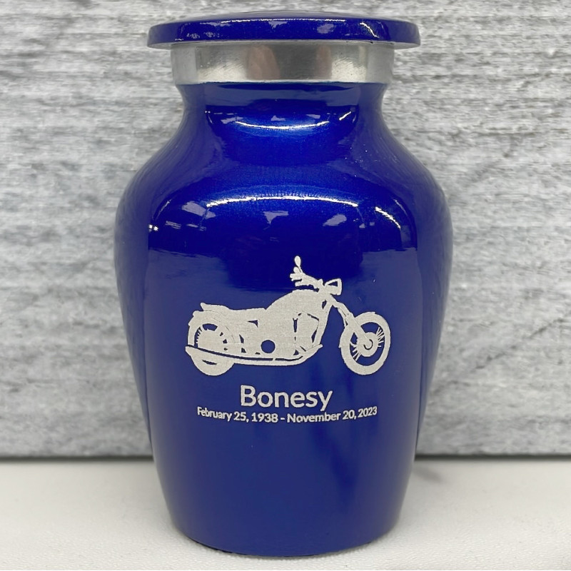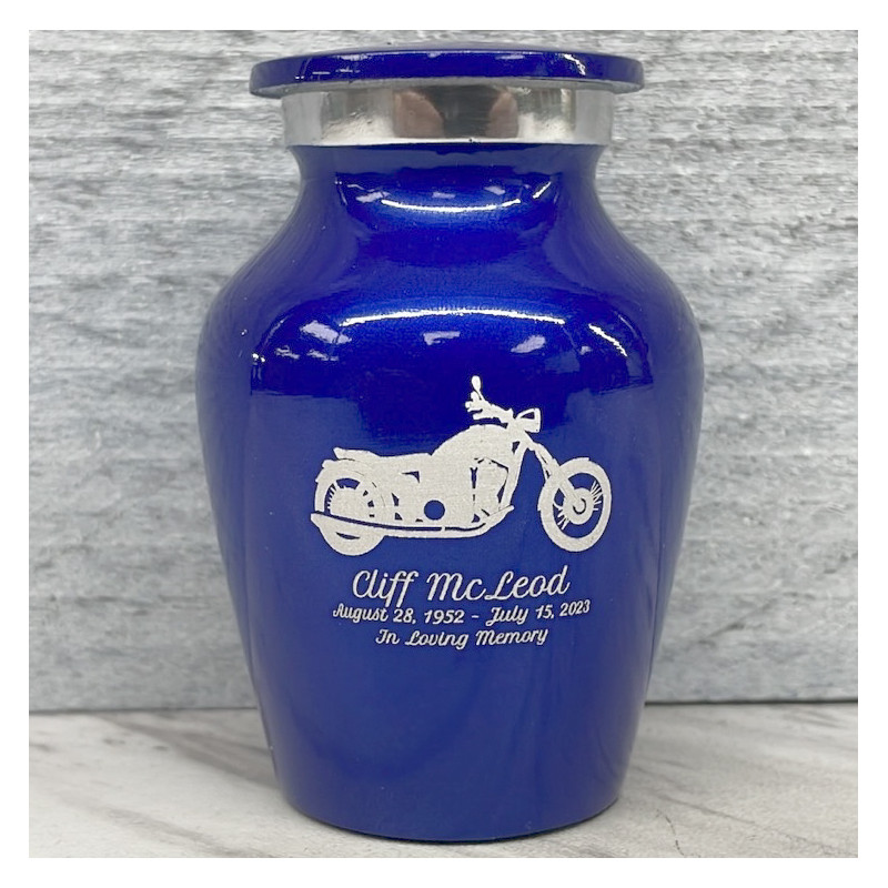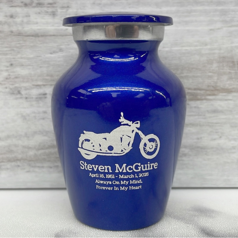 Complimenting a full size urn or a ceremony where most of the remains are scattered, this is a miniature urn that features an engraved motorcycle along with a name, date and room for additional sentiment lines on the front and room for custom engraved text on the back.