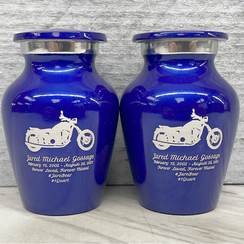 These were a perfect compliment to the full sized motorcycle cremation urn we bought. Got 4 of these for each of the kids so they can keep their father close to them. Was in a bit of a rush to have these engraved and they got them done just as promised i would highly recommend this company to anyone.