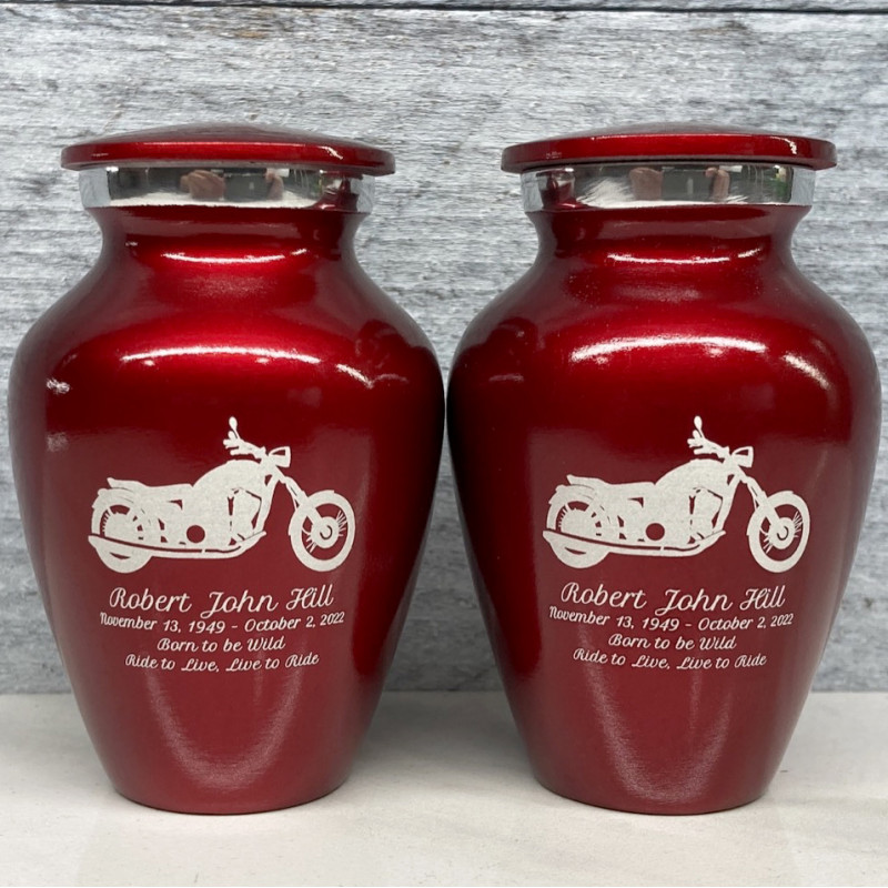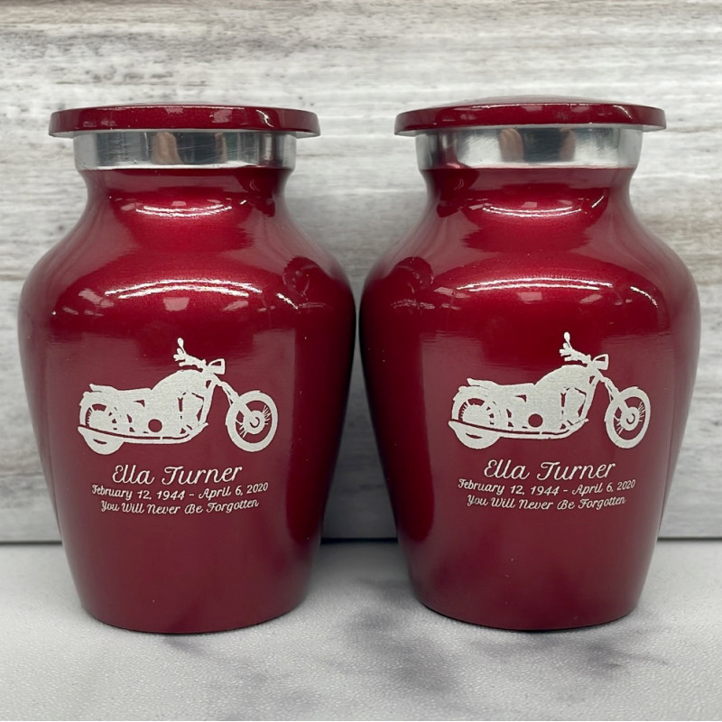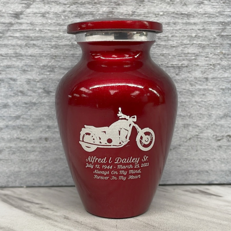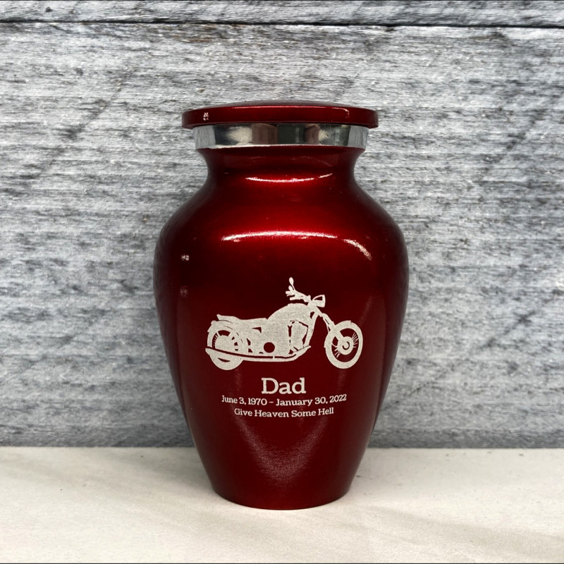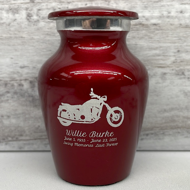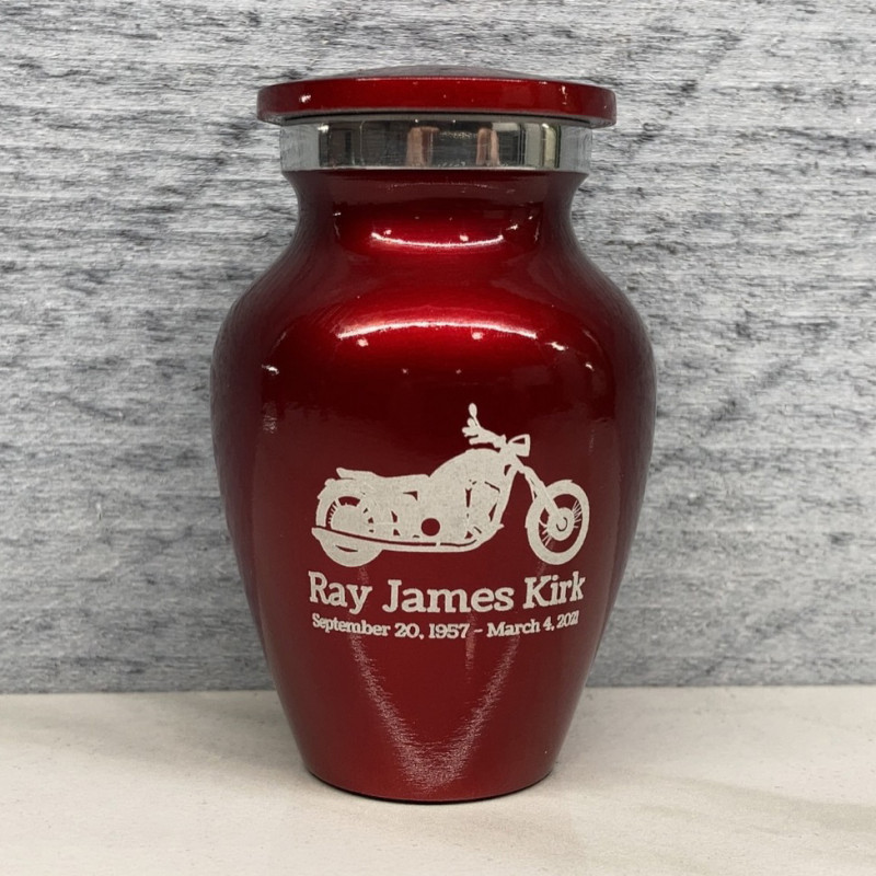 Celebrate your loved ones passion for the open road with this Ruby Red Motorcycle Keepsake Urn. With additional, optional, custom engraving you can add name, dates and up to three lines of text to create a truly custom memorial for yourself, family and close friends.