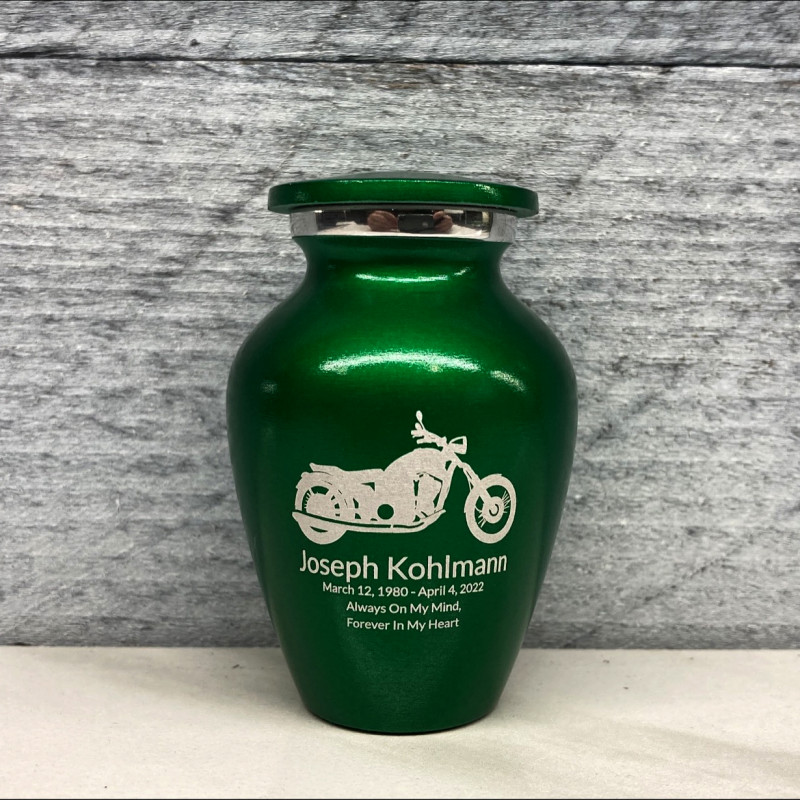 A Motorcycle Keepsake Cremation Urn in vivid Shamrock Green, this is a sharing urn that memorializes time out on the roads with friends and family.