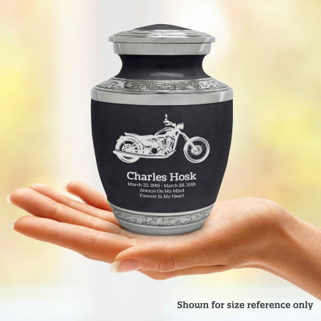 Select Motorcycle Sharing Urn - Ebony Black to create a personal memorial that is a step larger than a keepsake urn but more petite than a full size urn. Bold, attractive colors offer sharp contrast with the engraved text and detailed artwork.