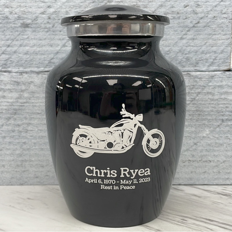 Select a Motorcycle Sharing Urn to create a personal memorial that is a step larger than a keepsake urn but more petite than a full size urn. Bold, attractive colors offer sharp contrast with the engraved text and detailed artwork.
