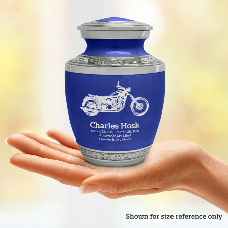 Select Motorcycle Sharing Urn - Royal Blue to create a personal memorial that is a step larger than a keepsake urn but more petite than a full size urn. Bold, attractive colors offer sharp contrast with the engraved text and detailed artwork.