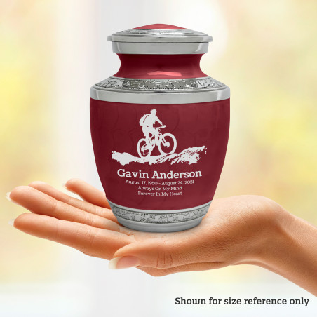 Select Mountain Bike Sharing Urn - Rose Red to create a personal memorial that is a step larger than a keepsake urn but more petite than a full size urn. Bold, attractive colors offer sharp contrast with the engraved text and detailed artwork.