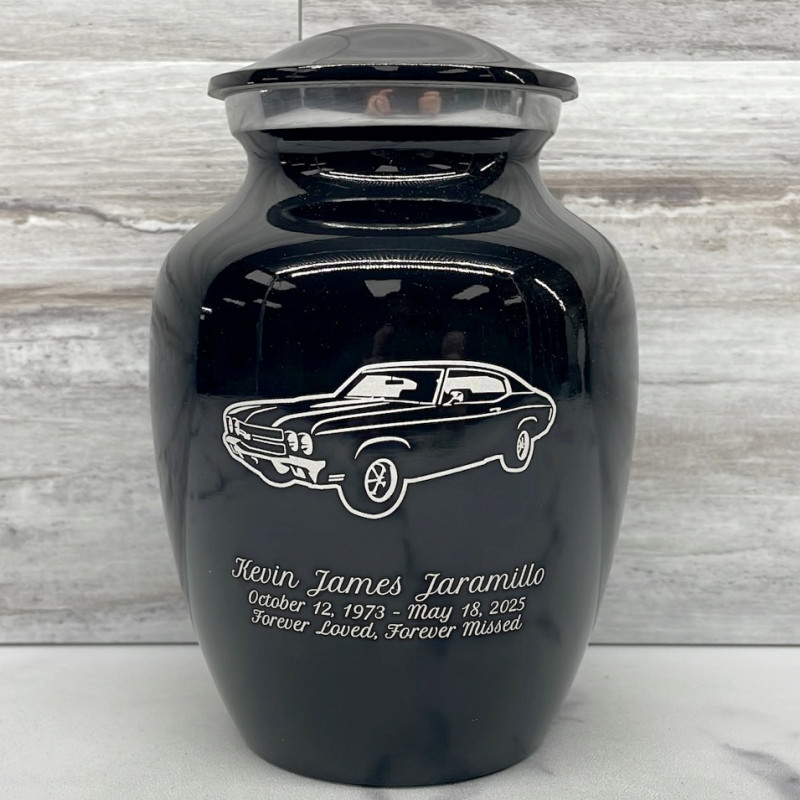 Select a Muscle Car III Sharing Urn to create a personal memorial that is a step larger than a keepsake urn but more petite than a full size urn. Bold, attractive colors offer sharp contrast with the engraved text and detailed artwork.