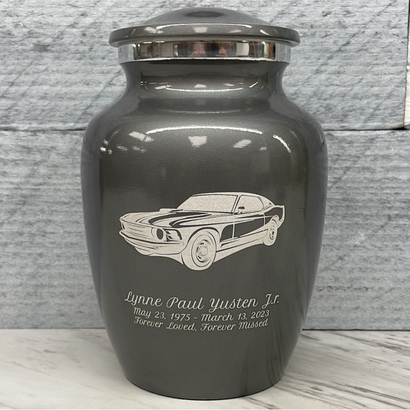 Remember your powerful car enthusiast with the Gunmetal Gray Muscle Car Sharing Cremation urn. It's an outstanding value that allows everyone in the family to have a memorial of their own. Optional engraving front and back there are many ways to make the urn unique to your loved one. A threaded lid and felt base ensure it securely closes and protects display surfaces.