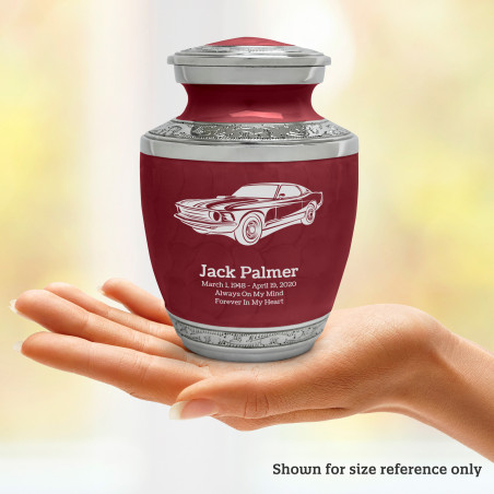 Select Muscle Car Sharing Urn - Rose Red to create a personal memorial that is a step larger than a keepsake urn but more petite than a full size urn. Bold, attractive colors offer sharp contrast with the engraved text and detailed artwork.
