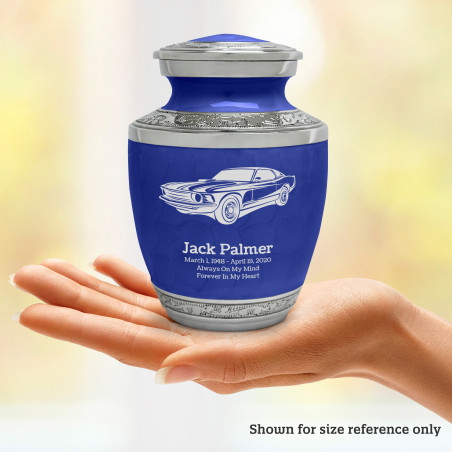 Select Muscle Car Sharing Urn - Royal Blue to create a personal memorial that is a step larger than a keepsake urn but more petite than a full size urn. Bold, attractive colors offer sharp contrast with the engraved text and detailed artwork.