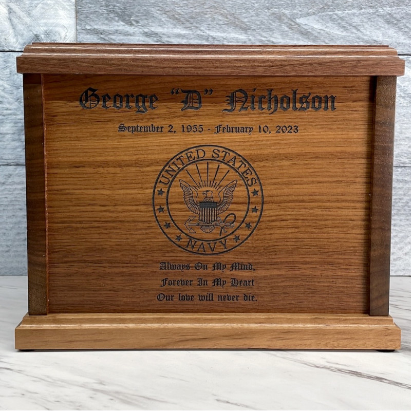 This made in the USA solid walnut Navy urn is custom built for Green Meadow Memorials to meet our demanding specifications for a beautiful, high quality hardwood urn.  The solid walnut has an attractive natural color that is timeless and works well with our direct laser engraving process.
