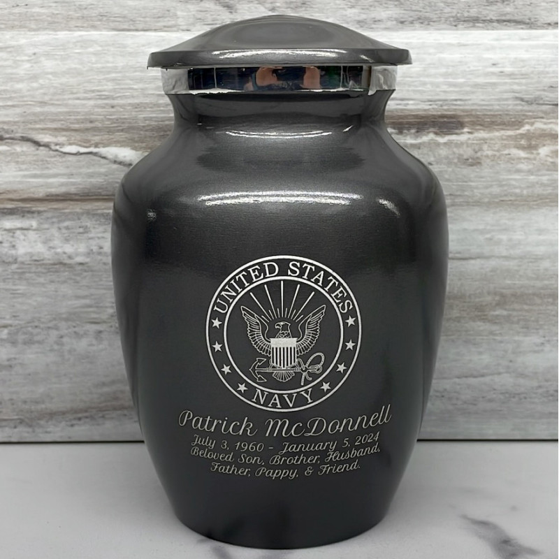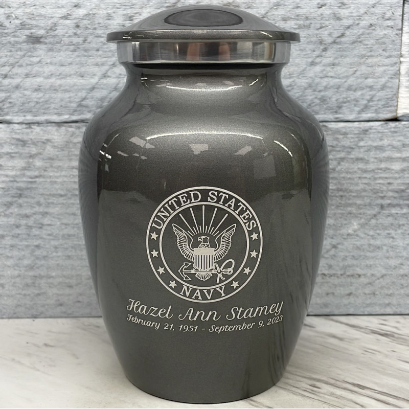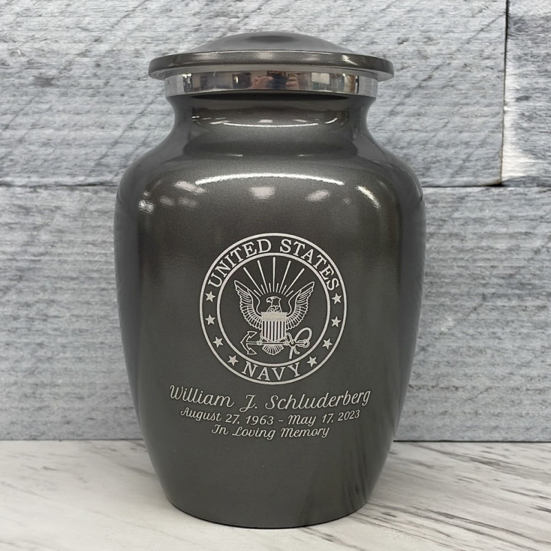 Remember the dutiful and patriotic spirit of your loved veteran with the Gunmetal Gray Navy Sharing Cremation urn. It's an outstanding value that allows everyone in the family to have a memorial of their own engraved with an Navy Emblem. With optional engraving front and back it can be made unique to your loved one. A threaded lid and felt base ensure it securely closes and protects display surfaces.