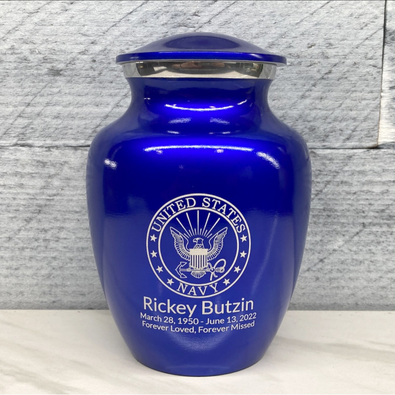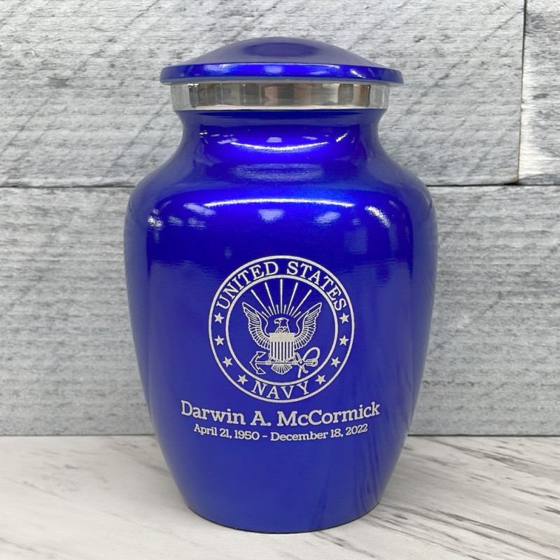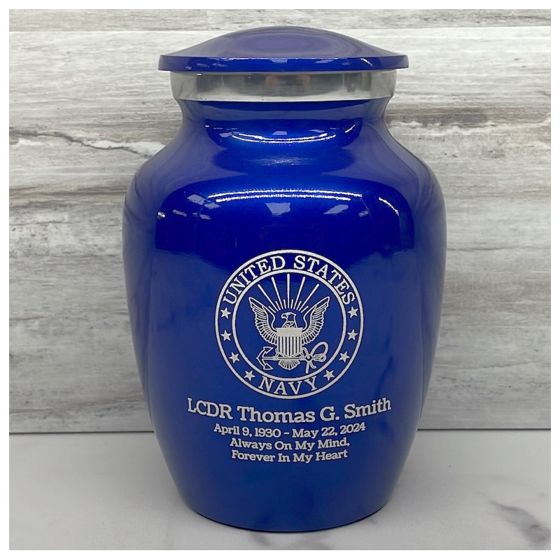 Remember the dutiful and patriotic spirit of your loved veteran with the Midnight Blue Navy Sharing Cremation urn. It's an outstanding value that allows everyone in the family to have a memorial of their own engraved with an Navy Emblem. With optional engraving front and back it can be made unique to your loved one. A threaded lid and felt base ensure it securely closes and protects display surfaces.