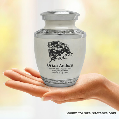 Select Offroad Truck Sharing Urn - Radiant White to create a personal memorial that is a step larger than a keepsake urn but more petite than a full size urn. Bold, attractive colors offer sharp contrast with the engraved text and detailed artwork.