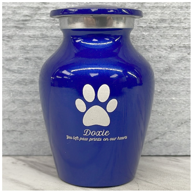 Choose the Midnight Blue Paw Print Keepsake Cremation Urn to create a handsome personal memorial for a beloved pet. The brilliant blue color, pawprint artwork and optional engraving ensure any family member or close friend can have a memorial to call their own.
