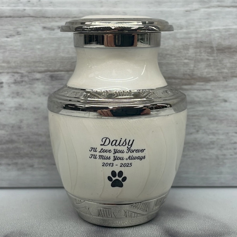 A keepsake urn that allows you to share the memory of your loved pet or keep them close. This pet cremation memorial is our beautiful Radiant White Cremation Urn in keepsake size.