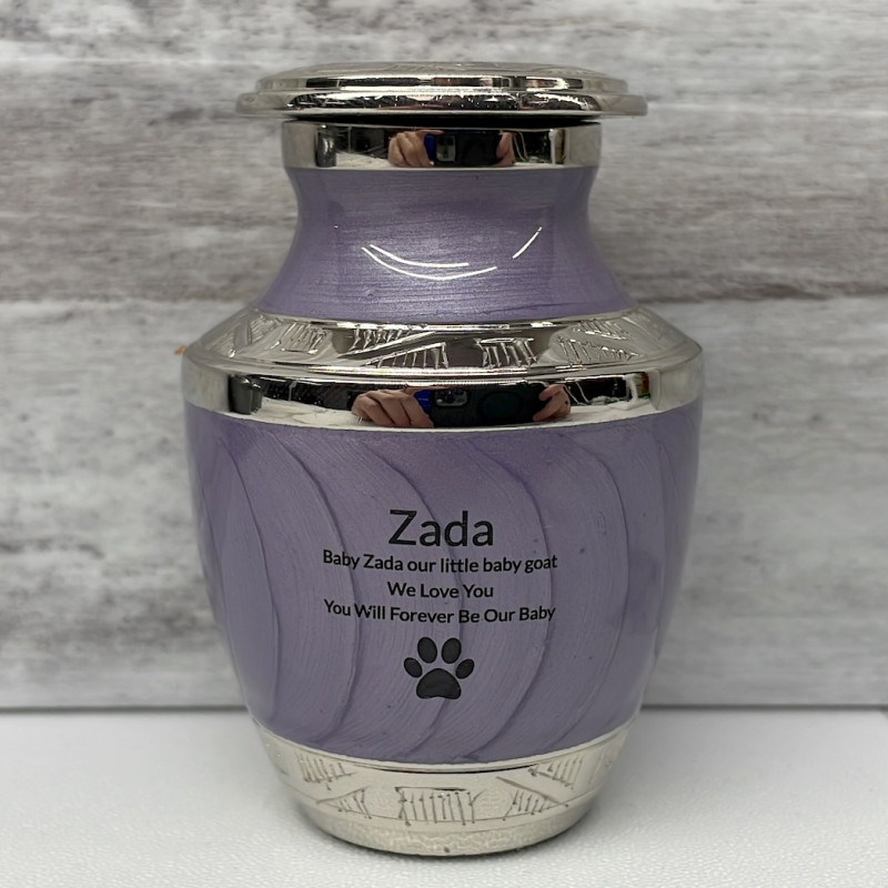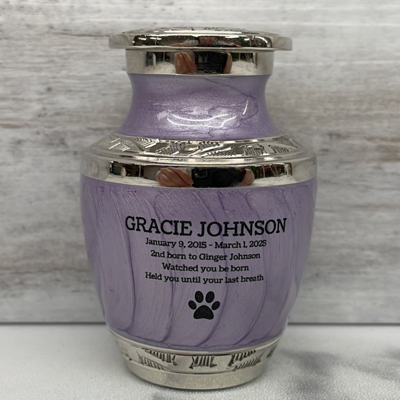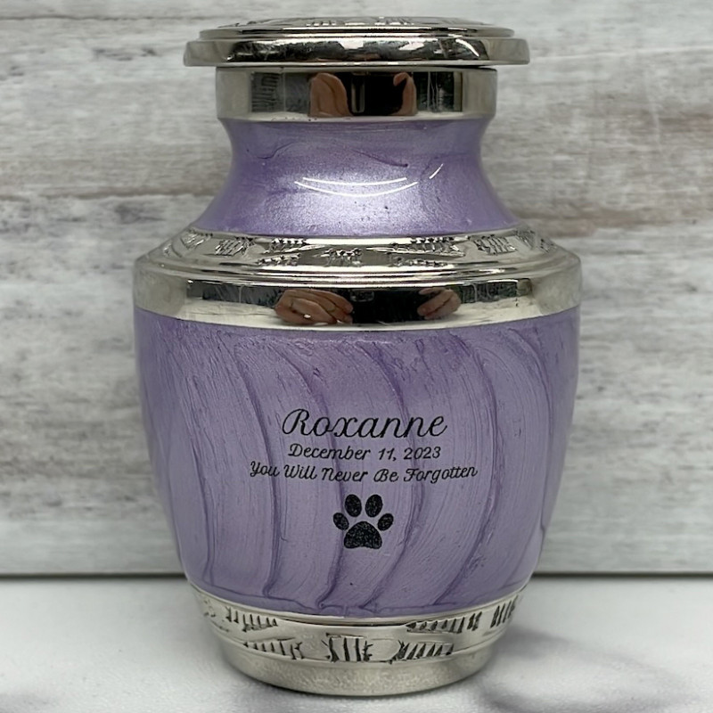 Our attractive Regal Purple Paw Print Keepsake Cremation Urn allows for a personal memorial that keeps your beloved pet close.