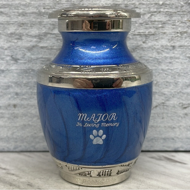 Our attractive Royal Blue Paw Print Keepsake Cremation Urn allows for a personal pet memorial that keeps your beloved pet close.