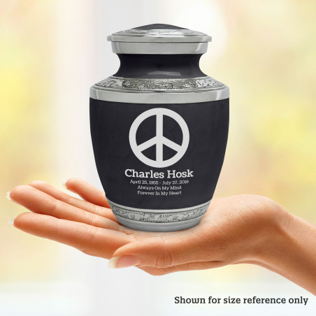 Select Peace Sharing Urn - Ebony Black to create a personal memorial that is a step larger than a keepsake urn but more petite than a full size urn. Bold, attractive colors offer sharp contrast with the engraved text and detailed artwork.