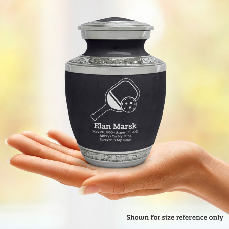 Select Pickleball Sharing Urn - Ebony Black to create a personal memorial that is a step larger than a keepsake urn but more petite than a full size urn. Bold, attractive colors offer sharp contrast with the engraved text and detailed artwork.