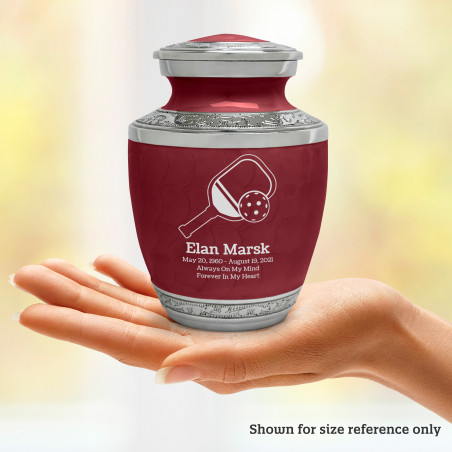 Select Pickleball Sharing Urn - Rose Red to create a personal memorial that is a step larger than a keepsake urn but more petite than a full size urn. Bold, attractive colors offer sharp contrast with the engraved text and detailed artwork.