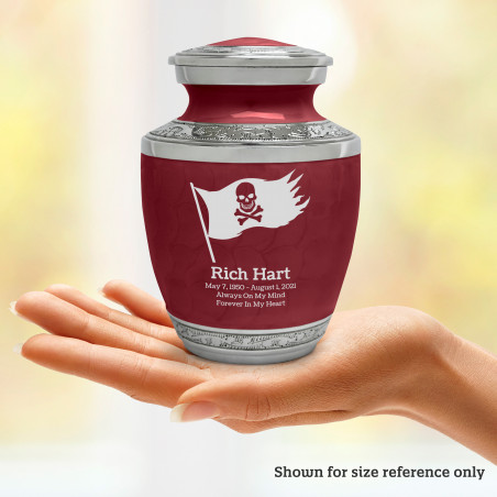 Select Pirate Flag Sharing Urn - Rose Red to create a personal memorial that is a step larger than a keepsake urn but more petite than a full size urn. Bold, attractive colors offer sharp contrast with the engraved text and detailed artwork.