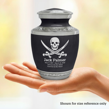 Select Pirate Skull Sharing Urn - Ebony Black to create a personal memorial that is a step larger than a keepsake urn but more petite than a full size urn. Bold, attractive colors offer sharp contrast with the engraved text and detailed artwork.
