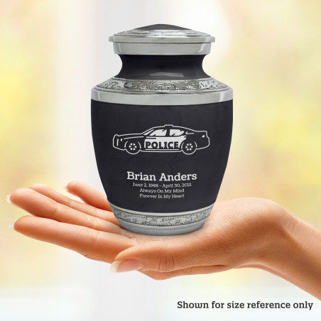 Select Police Car Sharing Urn - Ebony Black to create a personal memorial that is a step larger than a keepsake urn but more petite than a full size urn. Bold, attractive colors offer sharp contrast with the engraved text and detailed artwork.