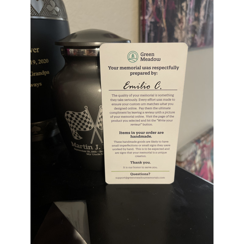 Celebrate your loved one's passion for racing with our Checkered Flag Urn in Gunmetal Gray. The metallic gray color and finish provides a stunning contrast to your artwork and engraving choices. For this reason, our Gunmetal Gray Urn the most popular urn we sell.