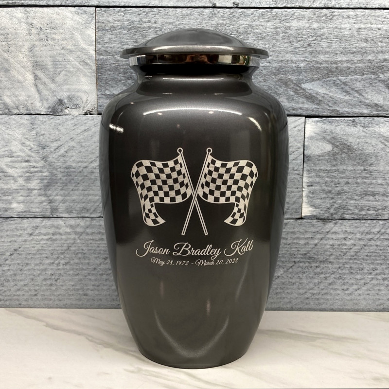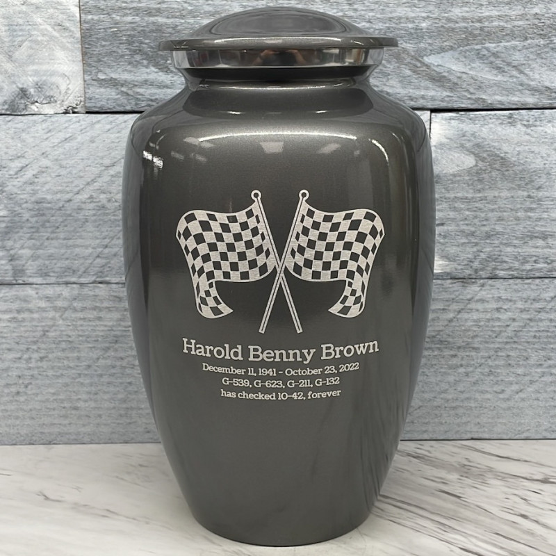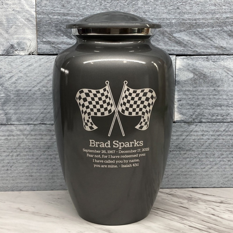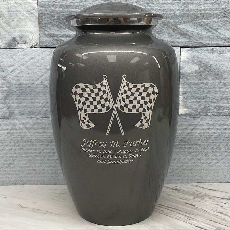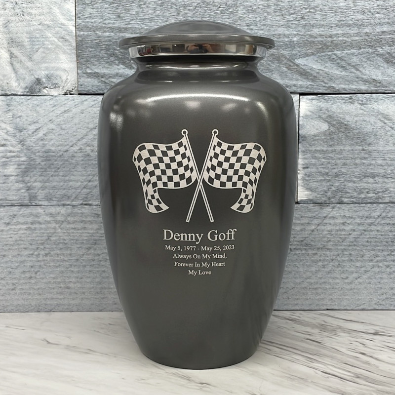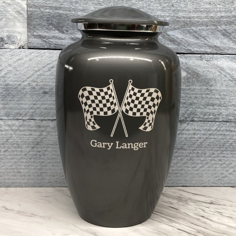 Celebrate your loved one's passion for racing with our Checkered Flag Urn in Gunmetal Gray. The metallic gray color and finish provides a stunning contrast to your artwork and engraving choices. For this reason, our Gunmetal Gray Urn the most popular urn we sell.